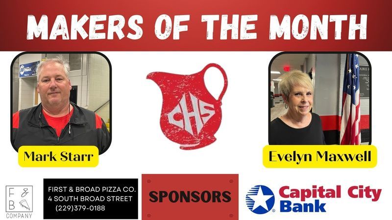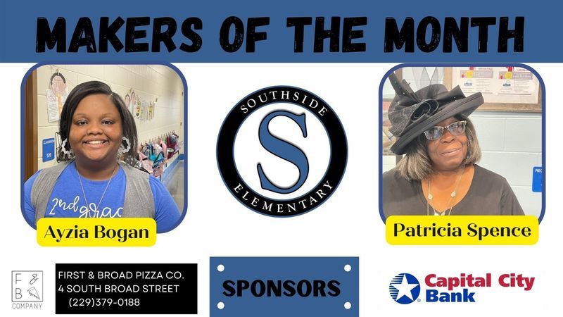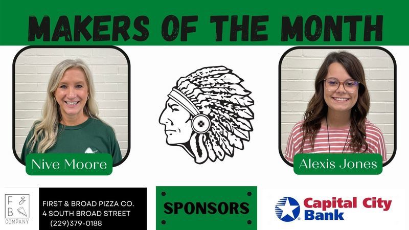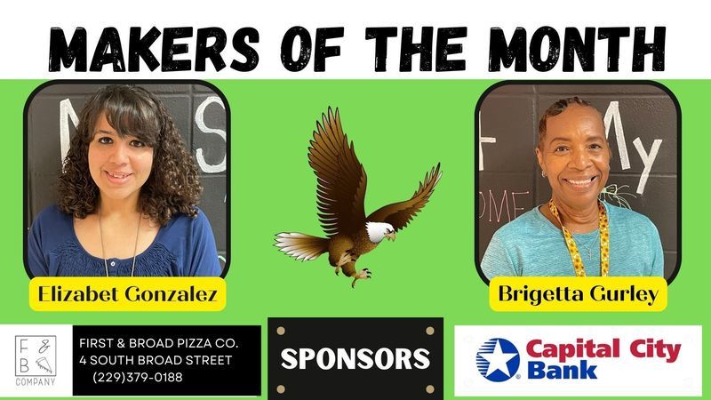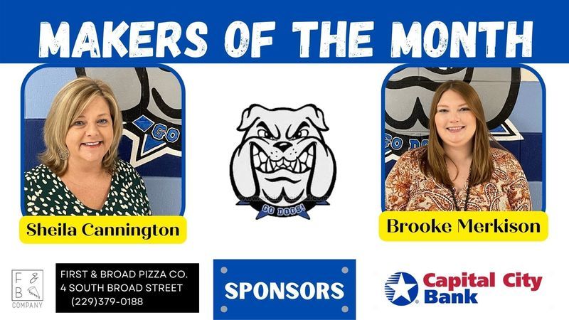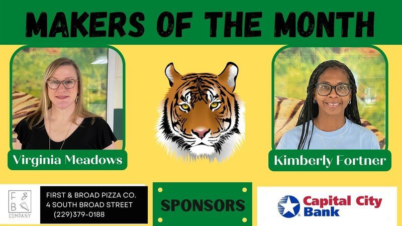 Each month two employees from each school are chosen to be recognized as Grady County Schools' Makers of the Month. For the month of February, selected employees received gifts from First & Broad Pizza Co. and Capital City Bank. Congratulations Makers of the Month and a big THANK YOU to our sponsors!