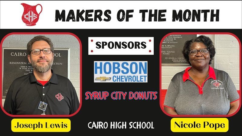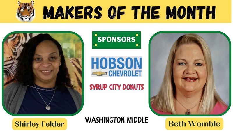 Each month two employees from each school are chosen to be recognized as Grady County Schools' Makers of the Month. For the month of April, selected employees received gifts from Hobson Chevrolet and Syrup City Donuts of Cairo. Congratulations Makers of the Month and a big THANK YOU to our sponsors!